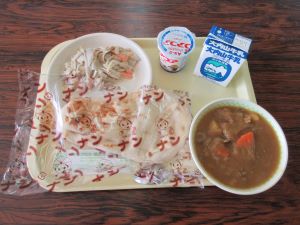 【献立】ナン、米粉のカレー、ごぼうサラダ、ヨーグルト、牛乳