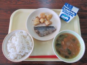 【献立】麦飯、鰆のしそ粉焼き、じゃがいものおかかまぶし、厚揚げの味噌汁、牛乳