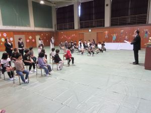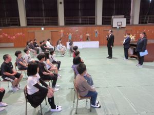 入学式を翌週の月曜日に控え、新6年生の児童が入学式の会場準備に来てくれました。
