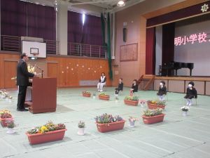 ↑着任式を行いました。新しく明小学校にみえた先生方から、お一人ずつ挨拶をしていただきました。