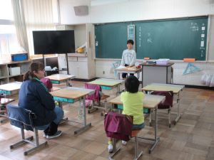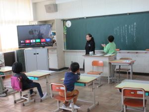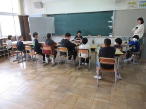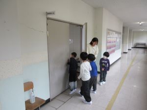 明小学校にはどんな場所や部屋があるのか、1年生の児童が担任の先生と一緒に学校を探検しました。