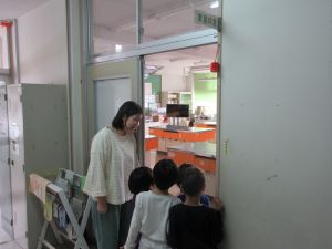 ↑「ここは家庭科室です。」「あっ、冷蔵庫がある。ここでお料理するの?」「大きくなったら、お料理の勉強もするよ。」