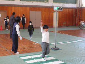 ↑お話の後に、体育館に作った道路を歩く練習をしました。