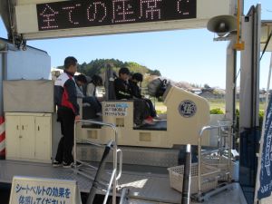 ↑JAFの方にも来ていただき、シートベルトの大切さについてお話を聞き、衝突実験を体験しました。事故の時の衝撃の怖さと、シートベルトの大切さが伝わったようでした。