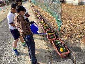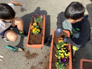 ↑100株以上のパンジーやビオラをいただきました。それを2・3年生の児童がプランターに植え替えました。