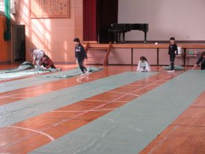 ↑4・5年生が協力をして、体育館の床にシートを敷いていきました。