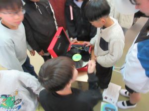 ↑ボブ・マーリーのレコードを、レコードプレイヤーで再生して聞きました。初めてレコードを見る子も多く、みんな興味津々でした。
