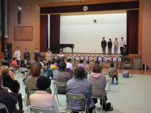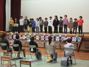 ↑1~3年生全員で、「風になる」を合唱し、歌のプレゼントもしました。
