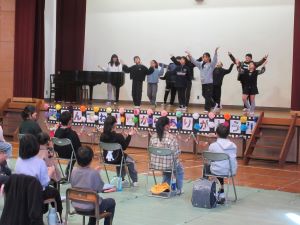 ↑ジャマイカ出身のボブ・マーリーの曲のさびの部分をみんなで歌いました。何度か繰り返すと、みんなしっかりと声が出てきました。