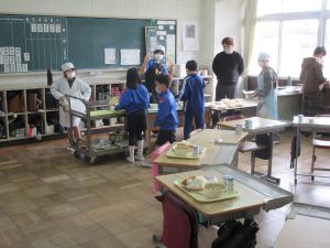 ↑盛り付けが終わると、1~3年生が給食を運びました。