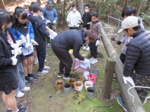 ↑植え替えた後は、しっかりと水やりをしました。卒業式の会場を明るく彩ってくれるようにお世話をしていきたいと思います。