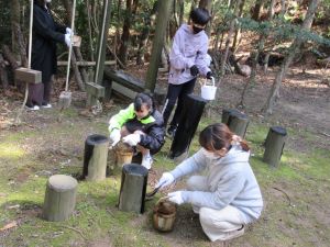 6年生が卒業前の奉仕作業として、明の森の木製遊具に防腐剤を塗りました。PTA役員さんと6年生保護者の有志の方も、一緒に作業をしていただきました。