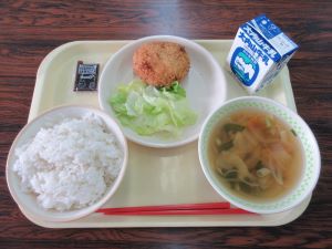 【献立】麦ごはん、手作りツナコロッケ、添えレタス、湯葉のスープ、牛乳