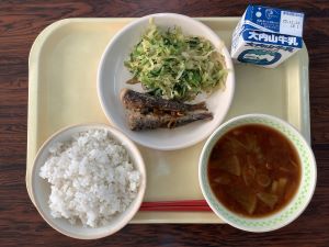 【献立】麦飯、鰯の南蛮漬け、キャベツと水菜の胡麻和え、大根の味噌汁、牛乳