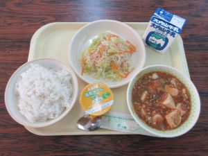 子どもたちの大好きな麻婆豆腐。中国ではトウガラシなどの香辛料を入れるため、大変辛い物が多いですが、給食では子どもにも食べやすい味付けになっています。