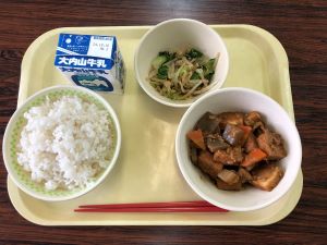 【献立】麦飯、厚揚げのみそ炒め、もやしとチンゲン菜の胡麻和え、牛乳