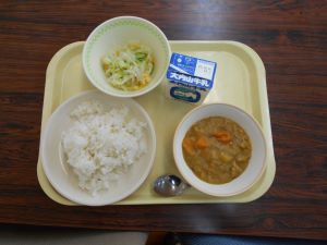 今日のメニューは、子どもたちの大好きなカレーでした。鶏肉はとてもやわらかくて、おいしかったです。