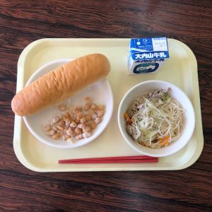 【献立】減量ロールパン、焼きビーフン、シュガービーンズ、牛乳