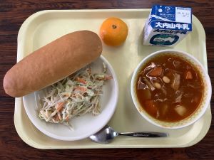 【献立】ロールパン、ポークビーンズ、ゴボウサラダ、みかん、牛乳