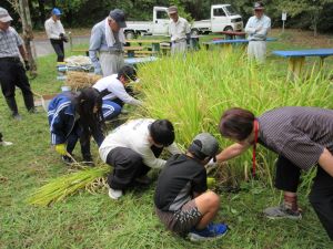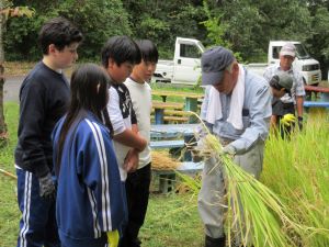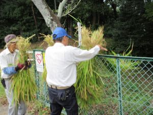 ↑いきいき支援の会の方から、ノコギリ鎌の使い方や、一束ずつ握って刈り取ることなどを説明してもらいました。