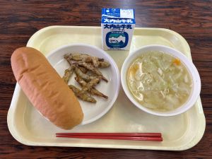 【献立】ロールパン、ワカサギのから揚げ、白いんげん豆のスープ、牛乳