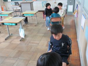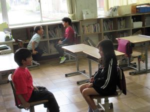↑友達と、何かの話題から会話を広げていくという学習でした。1年生と2年生がペアや3人組になって、会話をしていきました。