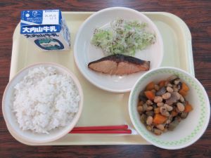 【献立】麦飯、鮭の生姜焼き、五目豆、キャベツのしそあえ、牛乳