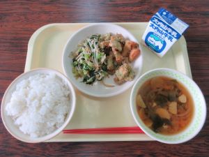【献立】麦飯、イカのあおさ揚げ、小松菜としめじの和え物、マコモダケの味噌汁、牛乳