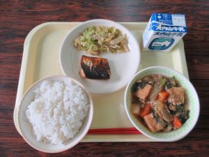 【献立】麦飯、サバの一味焼き、大根のそぼろ煮、キャベツともやしのおかかあえ、牛乳