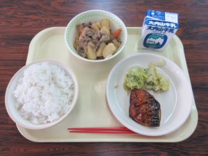 【献立】麦飯、サバの一味焼き、肉じゃがのうま煮、白菜漬け、牛乳