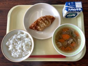 【献立】麦飯、津餃子、春雨スープ、牛乳