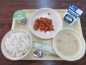 【献立】麦飯、スロッピージョーサンドの具、ジャガイモのポタージュ、葡萄ゼリー、牛乳