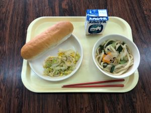 【献立】減量ロールパン、五目うどん、中華こんにゃくサラダ、牛乳