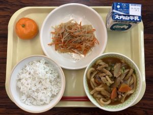 【献立】減量麦ごはん、みそ煮込みうどん、いためなます、みかん、牛乳