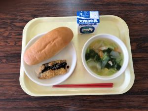 【献立】ロールパン、シイラフライ、チンゲン菜とジャガイモのスープ、牛乳