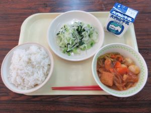 【献立】麦飯、厚揚げとうずら卵の甘酢あん、ナムル、牛乳