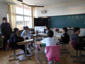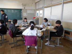 国語の授業です。2グループに分かれて、1つの話を5人でつなげています。おもしろい話ができあがったかな。