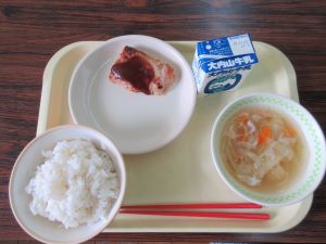【献立】麦ごはん、野菜スープ、おから入りミートローフ、牛乳
