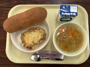 【献立】ロールパン、ツナとマカロニのグラタン、キャベツとコーンのスープ、いちごジャム、牛乳
