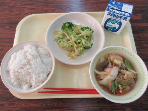 【献立】 麦ごはん、かしわのじゅんじゅん、ブロッコリーの梅風味あえ、牛乳