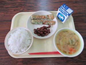 【献立】麦ごはん、ちくわのあおさ揚げ、金時豆の甘煮、石狩汁、牛乳