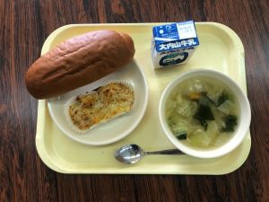 【感想】ツナとマカロニのグラタンは、マカロニがやわらかくておいしかったです。キャベツのスープは、キャベツがシャキシャキしていました。今日はいつものパンじゃなくて、黒糖パンだったので甘くておいしかったです。