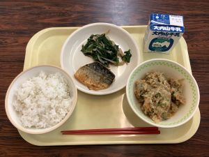 【献立】麦ごはん、さばの塩焼き、おからの炒り煮、ほうれん草のおひたし、牛乳