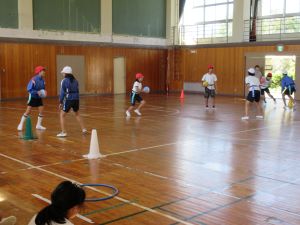 体育の授業で4~6年生が「フラッグフットボール」の導入としてボール鬼ごっこを行いました。