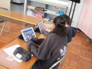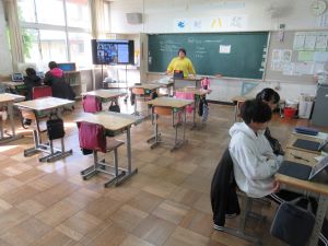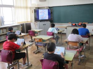 ↑6年生はそれぞれのタブレットを使い、英語で台湾の小学生と交流をしました。
