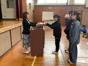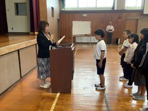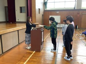 ↑後期児童会役員が、校長先生から任命状を受け取りました。