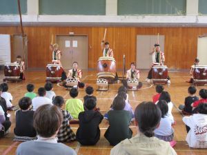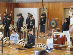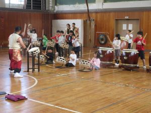 ↑演奏を聴いた後に、体験をさせていただきました。太鼓の数の関係で、まず低学年がたたきました。みんなとてもうれしそうでした。