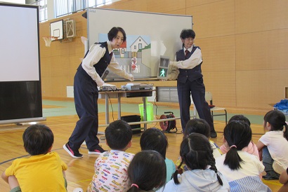 まず,交通教育プロバイダの方から「右側を歩く」「信号を守る」「飛び出しをしない」など道路を歩く時を気をつけることについて,信号機の模型などを使いながら,分かりやすくお話しいただきました。