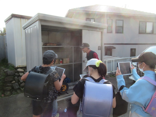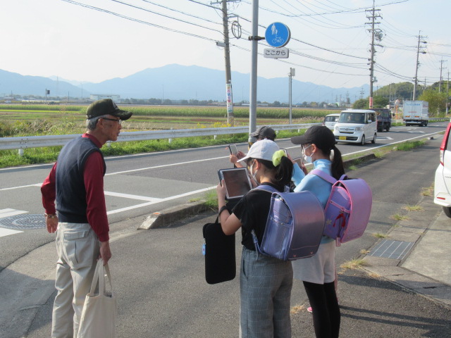 27日(金)、5,6年生が自治会長さんと一緒に自分の住む地域の危険箇所(防災や交通)を回り、説明を聴きました。このことを自分たちでタブレットPCなどを使ってまとめ、後輩に伝える予定です。