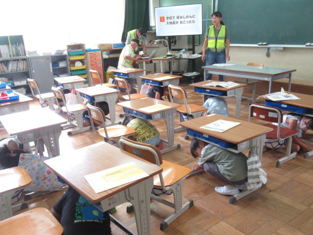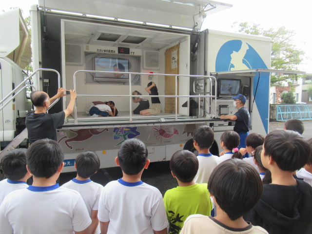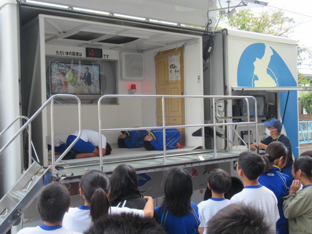 起震車の体験では、震度6弱のゆれを体験しました。また1年生から4年生までは、クラスで防災学習・体験を行いました。起震車体験では、「震度6弱のゆれのすごさがわかった。」、「本当に地震が起こった時、うまく非難できるか不安だ。」といった声が聞かれました。今日の体験で思ったことや考えたことを忘れないようにしてほしいと思います。